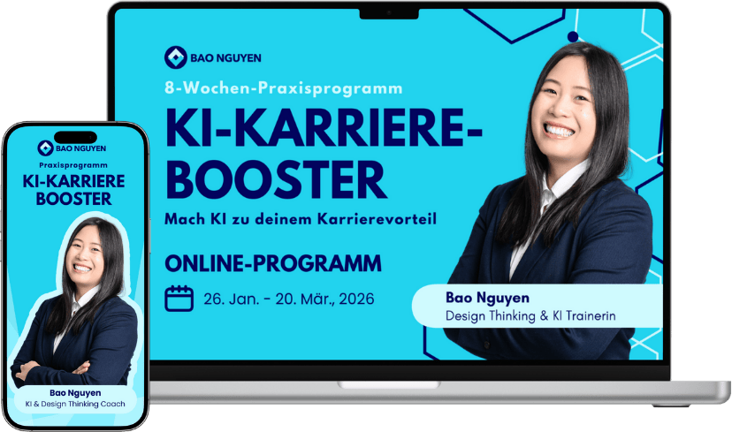 Ich bin Bao Nguyen, KI- und Design Thinking Coach mit Master in Wirtschaftsinformatik. Seit über sieben Jahren entwickle ich digitale Produkte für Unternehmen wie Henkel, Dr. Oetker, Kleinanzeigen und IBM und habe KI-Trainings für über 40.000 Mitarbeitende gestaltet. Mir ist wichtig, KI nicht nur theoretisch zu erklären, sondern sie direkt erfahrbar zu machen, damit Lernen leicht fällt und du schneller ins Handeln kommst.